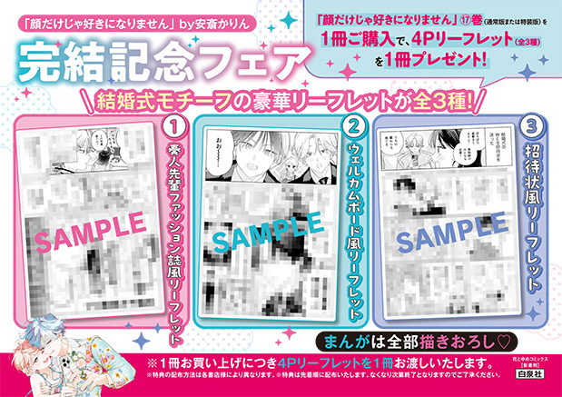 「顔だけじゃ好きになりません」17巻特装版・通常版のいずれかをご購入の方に結婚式をテーマにした4Pリーフレットをプレゼントいたします!